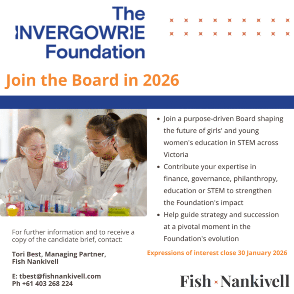 The management of the Foundation is reliant on the experience and dedication of our CEO, Kim Bartlett. Kim has been with the Foundation for 10 years and during this time she has been integral in developing the work of the Foundation and its sound financial management through implementing strategic initiatives and forging impactful partnerships to improve outcomes for girls in STEM. She has also focussed on optimising core business processes, strengthening our relationship with former Invergowrie Homecraft Hostel students and revitalising the Foundation’s website and publications.